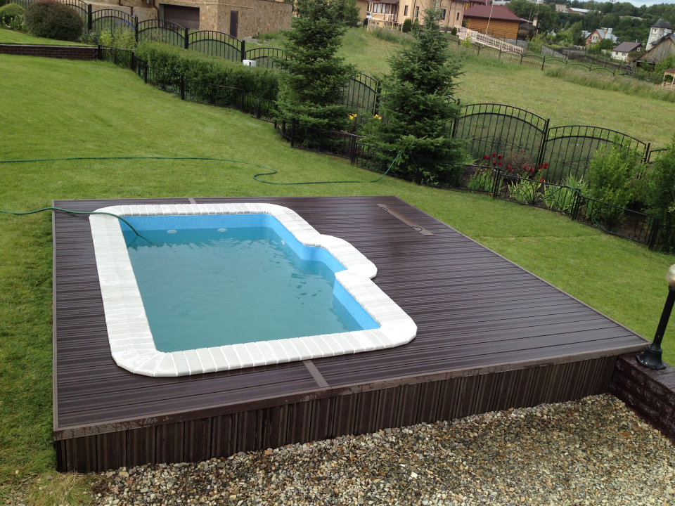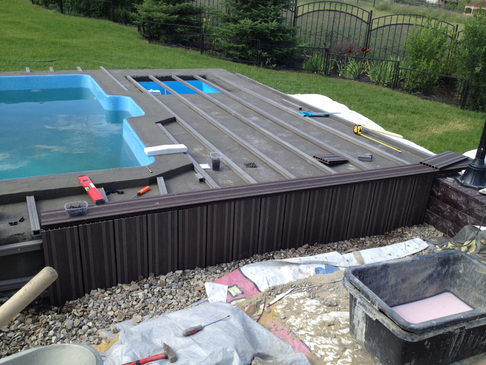 6 этап - нанесение гидроизоляции на босоножную зону, облицовка террасной доской и укладка бортового камня.